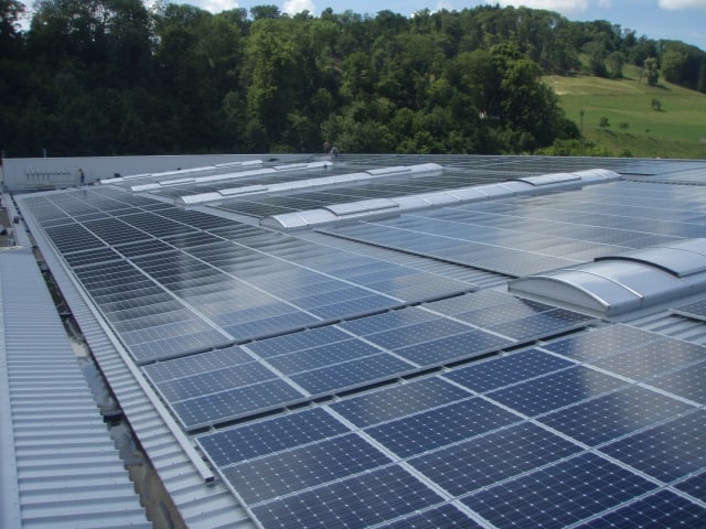 Auf dem Erweiterungsneubau der Einstellhalle der Autobus AG in Liestal wurde ein flach geneigte PV-Anlage gewählt, die den statischen Anforderungen der weit gespannten Holzbau Halle Rechnung trägt.